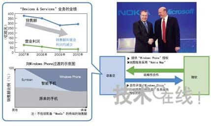在移動產(chǎn)品的全球最大規(guī)模展會“Mobile World Congress 2011”(2011年2月14~17日)開幕前的2月11日,諾基亞宣布了“歷史性”戰(zhàn)略轉(zhuǎn)換方針。該公司將與美國微軟進(jìn)行戰(zhàn)略合作,合作內(nèi)容包括采用“Windows Phone”作為智能手機(jī)的主要平臺等(圖1)。