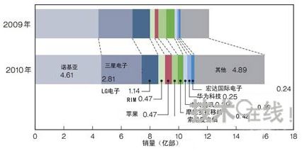 2010年的手機(jī)全球銷量比上年增加31.8%,約為16億部。RIM、蘋果、ZTE、HTC以及華為的銷量順利增長,但LG、索尼愛立信和摩托羅拉移動等的銷量則出現(xiàn)減少。(圖:Gartner,2011年2月發(fā)行)