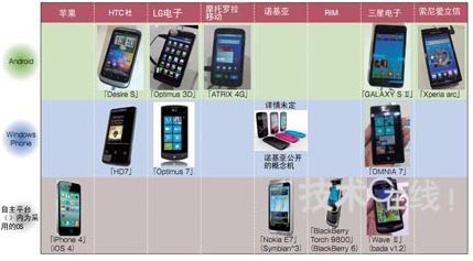 智能手機(jī)的平臺集中在Android、Windows Phone以及各廠商自主產(chǎn)品這三個平臺上。本圖以各廠商2011年發(fā)布的機(jī)型為中心,只標(biāo)示了具有代表性的產(chǎn)品。采用自主平臺的廠商還自行準(zhǔn)備了應(yīng)用商店等網(wǎng)絡(luò)服務(wù)。