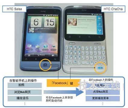 HTC發(fā)布了兩款適合使用SNS“Facebook”的智能手機(jī)。當(dāng)利用攝像頭拍照等預(yù)測用戶想在Facebook上共享信息時,F(xiàn)acebook鍵會自動閃光。摁下該鍵就會進(jìn)入上傳信息的畫面。