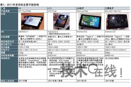 2011年1月,美國摩托羅拉移動公司(Motorola Mobility)發(fā)布了配備Android 3.0的平板終端“XOOM”,以此為開端,2011年2月韓國LG電子和三星電子分別發(fā)布了“Optimus Pad”和“GALAXY Tab 10.1”。HTC采用Android 2.3投產(chǎn)的首款平板終端“HTC Flyer”計劃升級至Android 3.0(表1)。2010年收購了美國Palm的美國惠普(Hewlett-Packard)也涉足了平板終端市場,并于2011年2月發(fā)布了“HP TouchPad”,采用Palm面向智能手機(jī)OS開發(fā)的“webOS”。