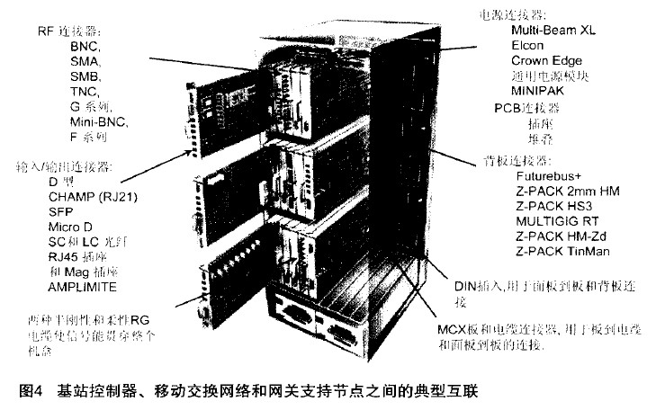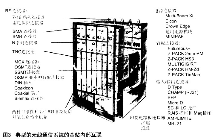圖3表示的是典型的無線通信系統(tǒng)的基站內(nèi)部互聯(lián),以及它所需要的各種各樣的電子連接器。從圖中可以看出,左邊基站所要求的都是射頻連接器,右邊表示的是電源連接器、背板連接器、輸入/輸出連接器和印制電路板連接器。