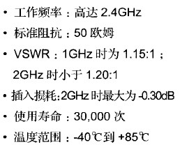移動手機用的開關(guān)式同軸連接器主要用于提供手機內(nèi)的天線和汽車外部天線之間的信號的切換。這種開關(guān)式的連接器,它的表面安裝有三種高度,分別是3.5mm、4.5mm和6.0 mm。表面安裝開關(guān)式連接器直接和手機天線連接。由于功率元件和天線或開關(guān)間距離短,因此內(nèi)部沒有電纜,信號傳輸非常好。它的性能指標如下: