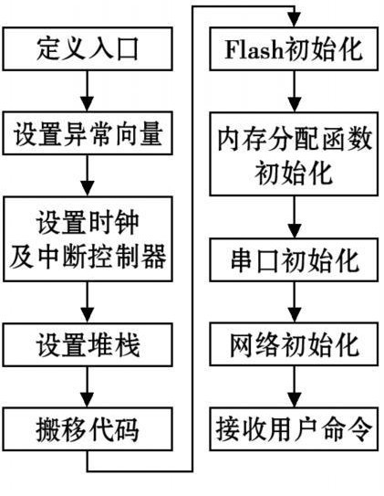 本設(shè)計中采用了帶有SNMP協(xié)議的μClinux操作系統(tǒng),實現(xiàn)方式簡單。不僅完成了串行接口到網(wǎng)絡(luò)接口的轉(zhuǎn)換,還使用戶可以通過監(jiān)控界面按照SNMP協(xié)議標準進行統(tǒng)一管理。對于μClinux系統(tǒng)U-boot是最合適的Bootloader,其設(shè)計過程如圖5所示。