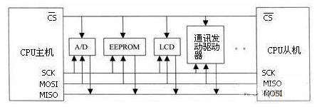 SPI(serial peripheral interface,串行外圍設(shè)備接口)總線技術(shù)是Motorola公司推出的一種同步串行接口。它用于CPU與各種外圍器件進(jìn)行全雙工、同步串行通訊。它只需四條線就可以完成MCU與各種外圍器件的通訊,這四條線是:串行時鐘線(CSK)、主機(jī)輸入/從機(jī)輸出數(shù)據(jù)線(MISO)、主機(jī)輸出/從機(jī)輸入數(shù)據(jù)線(MOSI)、低電平有效從機(jī)選擇線CS。當(dāng)SPI工作時,在移位寄存器中的數(shù)據(jù)逐位從輸出引腳(MOSI)輸出(高位在前),同時從輸入引腳(MISO)接收的數(shù)據(jù)逐位移到移位寄存器(高位在前)。發(fā)送一個字節(jié)后,從另一個外圍器件接收的字節(jié)數(shù)據(jù)進(jìn)入移位寄存器中。即完成一個字節(jié)數(shù)據(jù)傳輸?shù)膶嵸|(zhì)是兩個器件寄存器內(nèi)容的交換。主SPI的時鐘信號(SCK)使傳輸同步。其典型系統(tǒng)框圖如下圖所示。