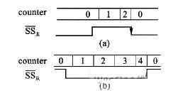 對從模式(MSTR=0),在沒有數(shù)據(jù)傳送的時候,SS高電平表示從器件未被選中,從器件不工作,MISO輸出高阻;在數(shù)據(jù)傳輸過程中,片選信號SS必須接低電平,且SS不允許跳變。如果SS從低電平跳到高電平,在SS的上跳沿,SPI模塊也將檢測到模式錯誤,清空內(nèi)部計數(shù)器counter,并結(jié)束正在進(jìn)行的數(shù)據(jù)傳輸。直到SS恢復(fù)為低電平,重新使SPEN=1時,才重新開始工作,如圖6(b)所示。