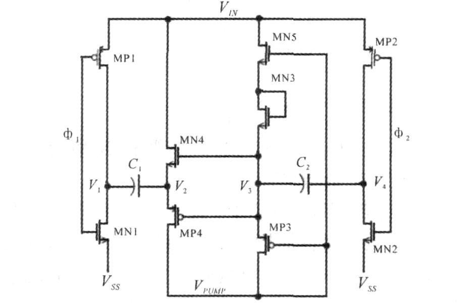 自舉電荷泵不需要為MN2和MP2提供柵驅(qū)動電壓,控制簡單,但輸出電壓會有一個閾值損失。圖3是改進后的電荷泵電路圖,1和2為互補無交疊時鐘。由MN2、MN5、MP3、MP2和電容C2組成的次電荷泵為MN4、MP4提供柵壓,以保證其完全關(guān)斷和開啟。當(dāng)1為低電平時,MP1導(dǎo)通,電位增加,此時,V3電位為零,MP4導(dǎo)通,V2上的電荷轉(zhuǎn)移到柵電容CGATE上,VPUMP電位升高。當(dāng)1為高電平時,MP2導(dǎo)通,為C2充電,V4電位上升至電源電位,V3電位隨之上升,MP3導(dǎo)通,VPUMP電位繼續(xù)升高。MN3相當(dāng)于二極管,起單向?qū)щ姷淖饔谩?br />