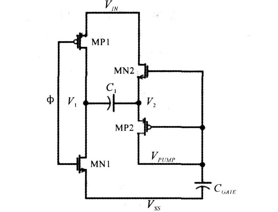 圖2為一種自舉型(SelfBoost)電荷泵的電路原理圖。圖中,為時鐘信號,控制電荷泵工作。初始階段電容,C1和功率管柵電容CGATE上的電荷均為零。當(dāng)為低電平時,MP1導(dǎo)通,為C1充電,V1電位升至電源電位,V2電位增加,MP2管導(dǎo)通。假設(shè)柵電容遠大于電容C1,V2上的電荷全部轉(zhuǎn)移到柵電容CGATE上。當(dāng)為高電平時,MN1導(dǎo)通,為C1左極板放電,V1電位下降至地電位,V2電位下降,MP2管截止,MN2管導(dǎo)通,給電容C1右極板充電至VIN。在的下個低電平時,V1電位升至電源電位,V2電位增加至2VIN,MP2管導(dǎo)通,VPUMP電位升至2VIN-VT。