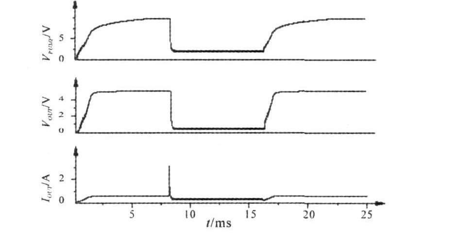圖5為負載正常情況下負載輸出電壓和功率管電流的仿真波形。電源電壓為5V,C1、C2電容值為1pF,時鐘周期為40s,NHV和MP6寬長比的比值為300,功率管的并聯(lián)個數(shù)為1103。采用0.6m30VBCD工藝,在典型條件下,用HSPICE對整體電路仿真。由波形可以看出,在1ms內(nèi),負載輸出電壓逐漸上升,功率管電流沒有過沖,啟動時間為1.7ms。3ms后,功率管完全開啟,為負載提供電源。