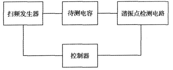 同時諧振發(fā)生時整個LC 回路表現出的阻抗為純阻性, 即感抗和容抗之和為零。利用這個原理, 使用一個掃頻信號激勵待測電容, 測量出諧振頻率, 再結合式(1) 即可測出寄生電感的大小 。根據該原理, 設計1 個掃頻發(fā)生器產生掃頻信號激勵待測電容, 然后找出諧振點, 讀出諧振頻率即可求出電容的寄生電感。其結構如圖3 所示。