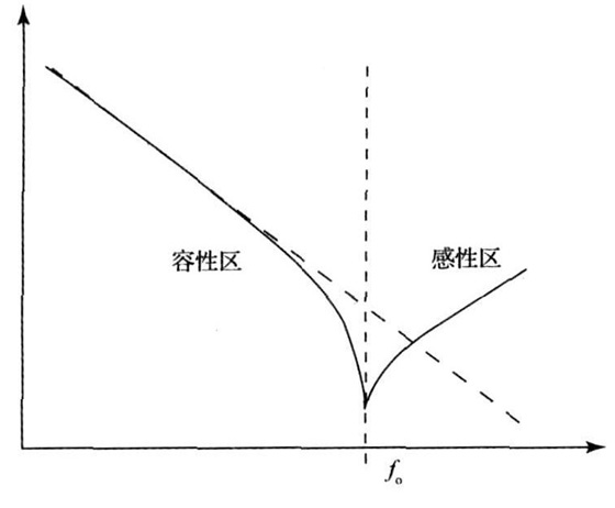 其中C 為實際電容本身的標稱電容, L 是其寄生電感, Rp是其并聯等效電阻, Rs 是其串聯等效電阻。寄生電阻會對經過電容的信號造成衰減, 但不會影響電容本身的頻率特性。寄生電感會與電容構成串聯諧振回路, 會使實際的電容在某個頻率上發(fā)生諧振, 這種現象稱為電容的自諧振 。實際電容的阻抗和頻率特性曲線如圖2 所示。
