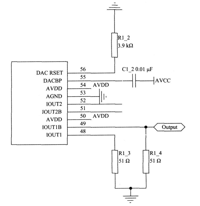 掃頻發(fā)生器在本系統中產生寬頻帶掃頻信號以激勵待測電容, 當電容較大時,以常見的電解電容為例,假設電容為1 000 F, 其寄生電感為100 nH, 則按照式(1)可計算出其自諧振頻率為15. 9 kHz, 諧振頻率較低;另以瓷片電容為例, 假設其電容值為10 pF, 寄生電感約為10 nH, 則其自諧振頻率為500 MHz 這兩個信號頻率相差了4 個數量級, 這就需要1 個寬帶的信號發(fā)生器, 這也是本部分的設計難點所在。若采用傳統的模擬信號發(fā)生的方法, 為了實現信號頻率的可調, 一般會采用變容二極管構成的LC 振蕩器, 然而在信號頻率較低時, 所需要的變容二極管的電容量會很大,而傳統的變容二極管電容值一般只是幾個pF 至幾百pF ,很難滿足低頻振蕩要求。為了簡化掃頻電路, 以及實現數字化控制, 這里采用DDS 技術產生寬帶信號。DDS 采用的是DA 轉換器的原理, 通過計數器累加實現的連續(xù)波形輸出 , 而DDS 芯片外圍電路簡單, 通過寫它的寄存器便可實現信號頻率的調節(jié), 同時產生的信號頻率分辨率高,一般可以達到0. 01 Hz 級別, 信號頻率的跨度大, 可以實現從幾Hz 到幾百MHz 的連續(xù)信號, 非常適合做掃頻發(fā)生器。這里采用了AD9854 這款DDS 芯片, 它在300 MHz 時鐘驅動下, 按照乃奎斯特采樣定律可以產生最高150 MHz 的信號,為了得到信號較好的頻率則一般只得到最高100 MHz 的信號。若要得到高于100 MHz 的信號, 則可采用其高次諧波得到?;贏D9854 的信號發(fā)生電路如圖4 所示。限于篇幅,僅畫出了關鍵的輸出部分和電流設置部分。AD9854 內置4~ 12 倍頻的時鐘倍頻器, 因此可以外加1 個較低頻率的時鐘,通過倍頻器倍頻至300 MHz, 這樣可以極大的降低高速片外時鐘對系統造成的電磁兼容性問題。AD9854 內部有1個頻率控制字寄存器,通過寫該寄存器的值便可以改變輸出信號的頻率, 非常適合數字控制。同時由于時鐘采用的時晶體振蕩器,因此輸出頻率的穩(wěn)定度和分辨率都非常高, 一般為10- 6數量級。