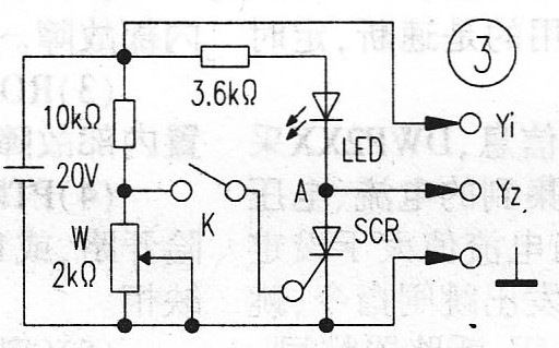 測試方法:示波器輸人耦合開關(guān)置“DC”擋,Y軸衰減開關(guān)置5V/cm。當(dāng)開關(guān)K未閉合時(shí),控制端未加控制電壓,則SCR不導(dǎo)通,回路電流幾乎為零,示波器屏上顯示的A點(diǎn)壓VA≈20V。合上開關(guān)K,調(diào)節(jié)電位器W的阻值(由小到大),直到可控硅導(dǎo)通為止,此時(shí)發(fā)光二極管LED亮,VA急劇下降(可控硅導(dǎo)通后的VA≈0.7V)。此時(shí)斷開開關(guān)K,則SCR繼續(xù)導(dǎo)通,LED仍亮,屏上顯示的電壓仍保持在0.7V左右,若要SCR截止,只有切斷電源才行。