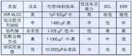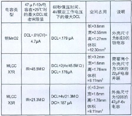 MLCC具有良好的低DCL特性,但在某些情況下,鉭電容能夠以更小的體積提供同樣低的DCL.表5 比較說明了根據(jù)DCL要求正確評估和選擇合適的電容的計算方法。如表5所示,鉭電容一般按照DCL最大值來確定規(guī)格。標(biāo)準(zhǔn)二氧化錳 (MnO2)構(gòu)造的鉭電容在生產(chǎn)廠家處是按照 (。01xCV) 進(jìn)行分級的。某些電容生產(chǎn)廠家還會隨DCL信息提供具體的保壓時間,并且根據(jù)比同級別的DCL最大值低得多的具體DCL限值進(jìn)行電容器的預(yù)篩選。