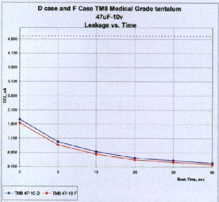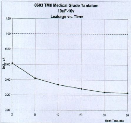 圖8是一種47uF-10V的鉭電容,雖然其最大DCL為4.7uA,根據(jù)特定的保壓時間篩選后,可為應(yīng)用提供超低DCL.以圖8的元件為例,該批量可以按照10秒鐘DCL 600nA的標(biāo)準(zhǔn)篩選,從而把總體 DCL 從 4.7uA 降至 600nA 限值。