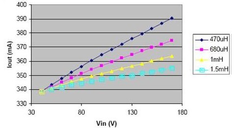 上圖是不同電感值下的頻率響應(yīng)。下圖說(shuō)明了電感減小時(shí),在輸入電壓的變化范圍內(nèi),負(fù)載電流的變化明顯增大。