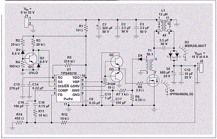 FET 關(guān)閉時(shí),繞組的電壓反向極性,以維持電流。整流器導(dǎo)電向輸出端提供電流時(shí),次級(jí)繞組電壓現(xiàn)在被鉗位至輸出電壓。通過變壓器作用,它對(duì)初級(jí)繞組的輸出電壓進(jìn)行鉗位。FET 的漏極電壓被鉗位至輸入電壓加輸出電壓。FET“關(guān)閉”時(shí)間期間,兩個(gè)繞組的電流流經(jīng) D1 至輸出端,而初級(jí)電流則流經(jīng) AC 電容。