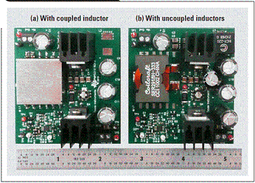 “表 1”所示規(guī)范為設(shè)計(jì)比較的基礎(chǔ)。第一個(gè)設(shè)計(jì)使用一個(gè)耦合電感,而第二個(gè)則使用兩個(gè)非耦合電感。
