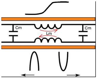 互阻抗沿著兩條走線呈均勻分布。串?dāng)_在數(shù)字門電路向串?dāng)_線打出上升沿時(shí)產(chǎn)生,并沿著走線進(jìn)行傳播: