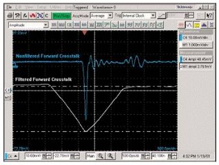 藍(lán)色波形是由白色波形濾波后減緩了脈沖上升沿得到的波形,它代表的就是對串?dāng)_進(jìn)行后濾波的結(jié)果。圖中顯示的紅色和藍(lán)色兩個(gè)串?dāng)_波形是以相同的電壓刻度顯示的。