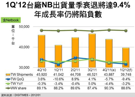 2012年第1季進(jìn)入歐美傳統(tǒng)淡季,亞洲傳統(tǒng)旺季需求亦不甚熱絡(luò),加上硬盤缺貨在1月最為嚴(yán)重,2月之后雖可逐月顯著改善,但英特爾(Intel)新CPU Ivy Bridge NB 4月上市在即,臺(tái)廠于3月即將開始大量出貨,致使1月硬盤未能滿足的舊CPU NB訂單將不具補(bǔ)單意義,進(jìn)而造成臺(tái)廠NB出貨量將再較上季衰退9.4%。也由于全球景氣不振,NB市況持續(xù)低迷,DIGITIMES Research資深分析師兼主任簡佩萍預(yù)估,第1季臺(tái)廠NB出貨量將再較2011年同期衰退3.2%,致使連續(xù)兩年第1季臺(tái)廠NB出貨量年成長率均為負(fù)值。