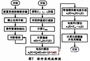 筆者設(shè)計了一臺1kVA的逆變電焊電源實驗樣機(jī),其系統(tǒng)的核心控制器是TI的DSP芯片TMS320LF2407A。TMS320LF2407A是一款高性能16位數(shù)字信號處理器,是TI公司定點DSP2000系列中的一員,它是專門為控制與運動控制的數(shù)字化實現(xiàn)而設(shè)計的。該DSP可完成逆變器輸出電壓頻率的控制、負(fù)載電壓和電流取樣、開關(guān)管的導(dǎo)通關(guān)斷時間控制等。其軟件實現(xiàn)流程圖如圖7所示。