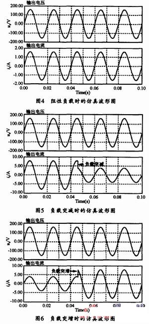 圖4給出了在輸入電壓為200V,額定負(fù)載分別為ZL=100Ω時的輸出電壓和輸出電流仿真波形;由圖4可見,輸出電壓頻率均能穩(wěn)定在50H z;圖5所示為負(fù)載突減時的仿真波形,其中突變部分是負(fù)載ZL=20Ω切換到ZL=40Ω時的輸出電壓、電流仿真波形;圖6為負(fù)載突增時的仿真波形,其中突變部分是負(fù)載ZL=40Ω切換到ZL=20Ω時的輸出電壓、電流仿真波形;通過以上仿真波形圖可知,該系統(tǒng)工作穩(wěn)定,靜態(tài)誤差小,并具有很強(qiáng)的魯棒型,同時,這種電流內(nèi)環(huán)電壓外環(huán)的雙閉環(huán)控制的動態(tài)響應(yīng)速度非???,因此可見,用該方法對該系統(tǒng)控制電路進(jìn)行設(shè)計是有效而可行的。