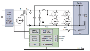 安森美半導(dǎo)體的全功能高強度放電(HID)(或氙燈)專用集成電路有助于改善前燈系統(tǒng)的性能。相對于傳統(tǒng)的鹵素?zé)?,HID改善了顯色性,降低了功耗,使用壽命更長,光輸出更高。為了支持其先進的功能,需要高效率的HID大燈鎮(zhèn)流器和復(fù)雜的控制電路。安森美半導(dǎo)體的HID燈控制系統(tǒng)是采用8位微控制器或?qū)S脿顟B(tài)機的混合模擬/數(shù)字解決方案,它集成了DC-DC控制器,具備全面的診斷功能(過壓、欠壓、溫度傳感器、續(xù)航時間計數(shù)器)、各種通信接口(LIN、SPI),支持35 W(D1/D2/D3/D4)和25 W(D5)燈。圖3為該專用集成電路的框圖。