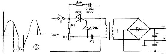 圖3是某電子雜志刊出的無級(jí)直流輸出調(diào)壓電路。原作者稱,利用Rc移相網(wǎng)路控制SCR的導(dǎo)通角改變變壓器初級(jí)的電流,從而獲得兩路連續(xù)可調(diào)的2x(0—17V) 的直流輸出電壓,負(fù)載電流為800mA 。很明顯,推薦電路(圖3)是普通移相式調(diào)功電路和降壓變壓器整流濾波電路的串聯(lián), 從基本原理分析,似乎無大的原則問題。變壓器初級(jí)每半周電流有效值隨可控硅導(dǎo)通角變化,次級(jí)輸出電壓的峰值、平均電流值都隨之而變。當(dāng)然,一定負(fù)載時(shí)輸出整流電壓也必然改變。本人看后,極感興趣,依此原理制作了一臺(tái)輸出100±40V范圍變化的維修代用直流電源,并依照圖中虛線加入RC吸收回路。實(shí)驗(yàn)時(shí),該電路一接入電源,距此10米遠(yuǎn)的電視機(jī)屏幕上即出現(xiàn)兩條緩慢移動(dòng)的黑帶(從鄰居的責(zé)問中得知),同時(shí),空載下不到十分鐘,SCR即擊穿。更不能容忍的是,降壓變壓器鐵心發(fā)出拖拉機(jī)啟動(dòng)時(shí)的聲音,室內(nèi)電度表也發(fā)出同樣的聲音,而且,隨著輸出電壓的調(diào)低,聲音更大。