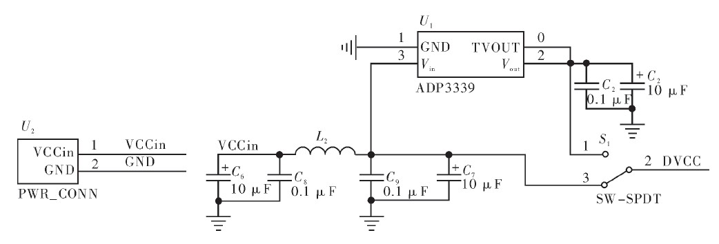 傳感器節(jié)點(diǎn)體積微小,通常攜帶能量有限的電池。能量供應(yīng)模塊在無(wú)線傳感器節(jié)點(diǎn)中至關(guān)重要,為傳感器節(jié)點(diǎn)各部分提供能量。需要長(zhǎng)時(shí)間數(shù)據(jù)采集的傳感器有的需要太陽(yáng)能等方式來(lái)維持節(jié)點(diǎn)的正常運(yùn)轉(zhuǎn)。節(jié)點(diǎn)的各部分也需要精心設(shè)計(jì)。節(jié)點(diǎn)微處理器的工作電壓為1.8~3.6 V,無(wú)線射頻芯片工作電壓為2.1~3.6 V,Flash供電電壓為2.7~3.6 V,USB轉(zhuǎn)換芯片由USB供電。因此電源可以選用3 V紐扣電池供電,有效減少了節(jié)點(diǎn)的大小。另外USB也可以作為供電源,同時(shí)作為編程電源,電源單元如圖2所示。LC濾波單元對(duì)交流電具有較好的濾波效果,同時(shí)又不會(huì)降低直流輸出電壓。低壓差的穩(wěn)壓器ADP3339保證了電源較好的穩(wěn)壓性。