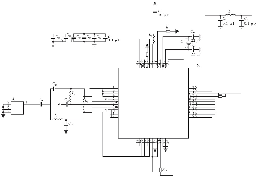 圖3中無(wú)線射頻模塊的外圍電路采用CC2420手冊(cè)提供的典型應(yīng)用電路的器件數(shù)值,這樣保證了芯片能工作在正常狀態(tài)。另外為達(dá)到最優(yōu)性能,必須使用電源去耦,去耦電容和電源過(guò)濾的設(shè)置和大小對(duì)于在應(yīng)用中獲得最優(yōu)性能起著關(guān)鍵作用,TI提供一個(gè)緊湊的參考設(shè)計(jì),必須嚴(yán)格按照該設(shè)計(jì)進(jìn)行。同時(shí)增加數(shù)字、模擬電源采用電容濾波。CC2420需要一個(gè)16 MHz的參考時(shí)鐘用于傳輸速率為250 kbit·s-1的數(shù)據(jù)收發(fā),參考時(shí)鐘可以來(lái)自外部時(shí)鐘源,也可以由內(nèi)部晶體振蕩器產(chǎn)生,這里采用內(nèi)部晶體振蕩器產(chǎn)生的方式。天線阻抗匹配至關(guān)重要,為獲得較好的發(fā)射功率,在原有基礎(chǔ)上對(duì)部分電容、電感進(jìn)行了適當(dāng)?shù)恼{(diào)整。CC2420與微控制器的通信通過(guò)4線SPI總線實(shí)現(xiàn)(SI、SO、SCLK、CSn),通過(guò)控制FIFO和FIFOP管腳接口狀態(tài)可以使芯片工作在發(fā)射或接收模式,另外CCA用于空閑信道評(píng)估,SFD用于控制時(shí)鐘或定時(shí)信息的輸入。