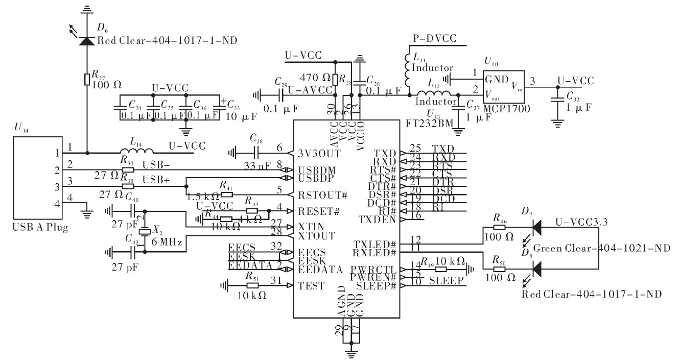 無(wú)線傳感器網(wǎng)絡(luò)由大量節(jié)點(diǎn)組成,這些節(jié)點(diǎn)按一定協(xié)議將采集的數(shù)據(jù)進(jìn)行融合、傳輸,最終將數(shù)據(jù)傳送到個(gè)人電腦上進(jìn)行處理和觀察,同時(shí)節(jié)點(diǎn)工作需要將特定的程序?qū)懭隖lash中。目前個(gè)人電腦最常用的接口為USB,而微處理器使用USART接口,為實(shí)現(xiàn)兩種接口之間轉(zhuǎn)換,節(jié)點(diǎn)使用FT232BM芯片作為轉(zhuǎn)換芯片。FT232BM是一種單片USB到異步串口轉(zhuǎn)換芯片,支持全握手和調(diào)制解調(diào)接口信號(hào),在TTL級(jí)數(shù)據(jù)傳輸速度范圍為300 bit·s-1~3 Mbit·s-1.芯片通過(guò)USB總線供電,工作電壓為4.35~5.25 V,采用外部6 MHz時(shí)鐘。USB PID、序列號(hào)和產(chǎn)品信息可以保存在外部EEPROM中。USB通信模塊接口如圖5所示。