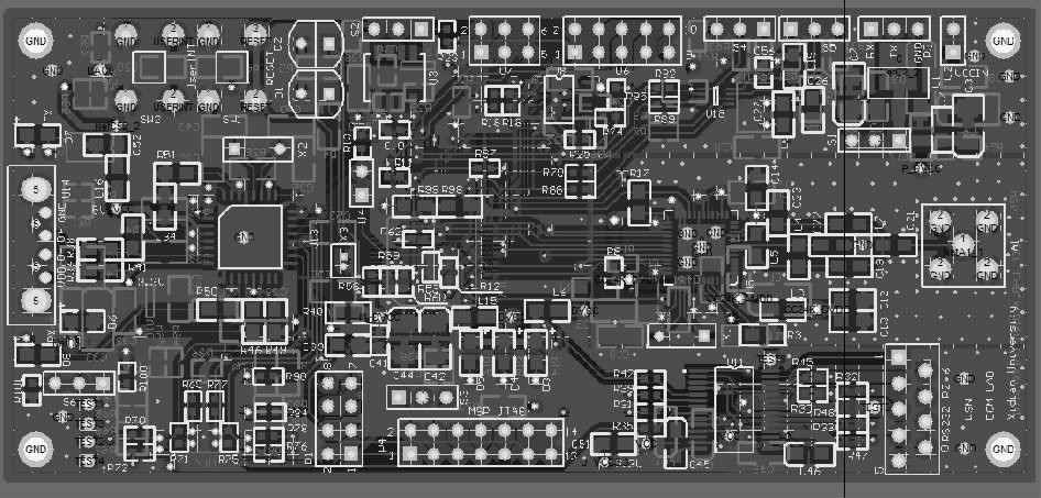 電路板根據(jù)不同的標(biāo)準(zhǔn)有不同的分類(lèi),在設(shè)計(jì)中大多數(shù)根據(jù)板的數(shù)目分類(lèi),在電氣連接關(guān)系復(fù)雜的電路板設(shè)計(jì)中,雙面板難以滿足電路布線的要求,這時(shí)就必須考慮使用多層板。本節(jié)點(diǎn)采用4層板,頂層主要是USB模塊和無(wú)線模塊,底層為微處理器模塊,內(nèi)部層為電源層和地層。設(shè)計(jì)結(jié)果如圖7所示。