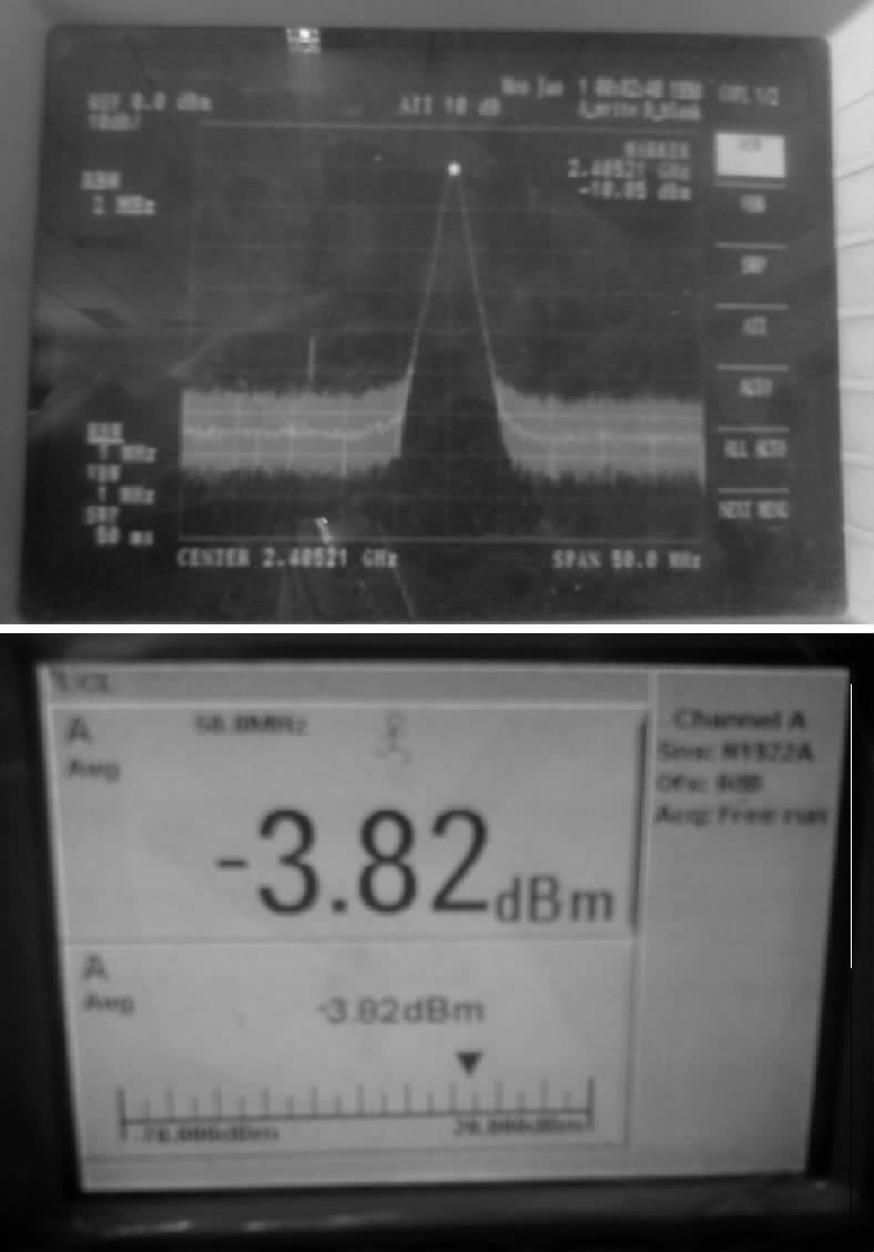 為對(duì)設(shè)計(jì)的節(jié)點(diǎn)功能進(jìn)行驗(yàn)證,首先使用IAR集成開(kāi)發(fā)環(huán)境編寫(xiě)CC2420的測(cè)試程序,通過(guò)JTAG將程序燒入Flash,經(jīng)過(guò)檢測(cè),射頻部分較好地滿足了預(yù)期。芯片工作頻帶范圍為2.4~2.48 GHz,發(fā)射功率為0 dBm.經(jīng)過(guò)頻譜儀和頻率計(jì)驗(yàn)證設(shè)計(jì)符合要求,驗(yàn)證結(jié)果如圖9所示。
