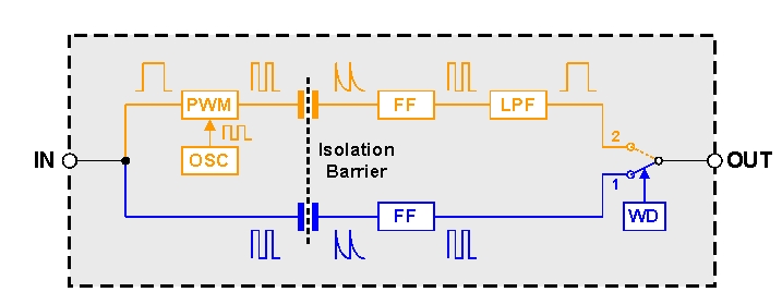低速路徑比高速路徑多出幾個功能元件。因為低頻輸入信號要求隔離勢壘禁止采用大電容,所以輸入信號被用于對內(nèi)部振蕩器(OSC)的載波頻率進(jìn)行脈寬調(diào)制(PWM)。這就構(gòu)成了一個非常高的頻率,能夠通過該電容勢壘。由于輸入得到了調(diào)制,因此必須在實際數(shù)據(jù)傳輸至輸出端以前使用低通濾波器(LPF)去除其中的高頻載波。