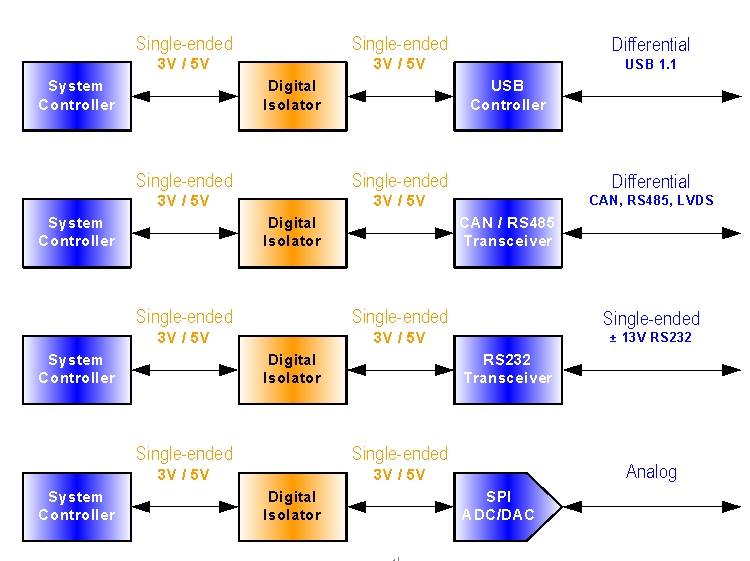 所有接口都有一個相同點,那就是數(shù)字隔離器必須安裝在隔離接口的單端3V/5V部分。