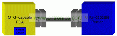 如上所述,線纜方向決定著連接處兩個(gè) OTG 設(shè)備扮演的設(shè)備角色。主機(jī)通信協(xié)議 (HNP) 定義了一種在主機(jī)和設(shè)備角色之間動態(tài)切換的方法。為什么要切換角色呢?如果我們查看圖 2,并考慮到每個(gè) OTG 設(shè)備都必須包括一個(gè) TPL,我們便能理解這種要求。左邊的設(shè)備在其 TPL 上有一臺打印機(jī),但其并“不”在打印機(jī)的 TPL 上。如果用戶“倒過來”插入線纜(如圖 2 所示),則如果不倒置角色兩個(gè)設(shè)備之間的通信便不可能進(jìn)行。把線纜從兩個(gè)設(shè)備取下,然后將線纜端點(diǎn)倒過來再重新連接,便可以實(shí)現(xiàn)通信。OTG 規(guī)范內(nèi)置到了協(xié)議中,以自動地應(yīng)對這種情況。HNP 允許靜默和自動角色倒置,從而實(shí)現(xiàn)通信。相比強(qiáng)制規(guī)定用戶斷開線纜然后倒置,這樣做提高了最終用戶體驗(yàn)。正因這樣,需要注意的主機(jī)通常為 A 設(shè)備但卻并非始終如此,這一點(diǎn)很重要。