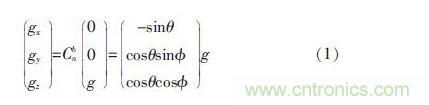 其中,Cbn為慣性坐標(biāo)系到載體坐標(biāo)系的變換矩陣;θ 為俯仰角;φ為橫滾角;g 為重力加速度; 可以通過測(cè)量重力加速度分量gx、gy、gz,計(jì)算出平衡車俯仰角θ1和橫滾角φ1估計(jì)值