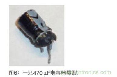 接著我用儀表檢測輸出電壓。在繼續(xù)閱讀下文之前,請回頭看一下圖2。你是否注意到最左邊那個緊鄰USB連接器的470μF電容器?我的手指擦過這個電容器,覺得很燙。然后我聽到呼的一聲,發(fā)現(xiàn)電容器爆裂開來,封裝的底端飛彈出去,見圖6。