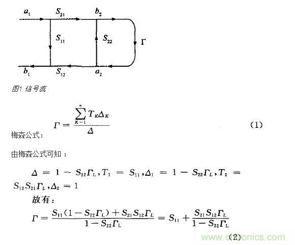 信號流圖(如圖1所示)結(jié)合散射參數(shù)是分析微波網(wǎng)絡和微波測量系統(tǒng)的簡便有效方法。流圖公式亦稱梅森不接觸環(huán)法則(Mason’s non-touching loop rule),簡稱梅森公式。根據(jù)梅森公式可以直接求出信號流圖中任意兩點之間的傳輸值。