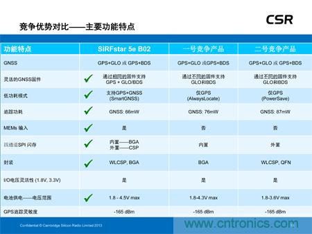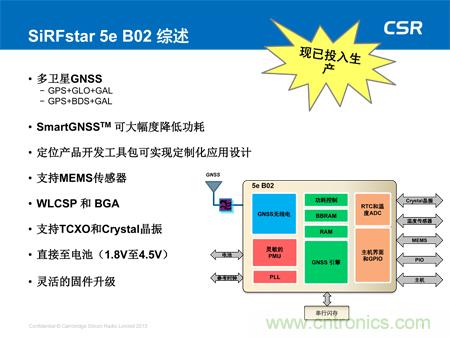 可穿戴設(shè)備應(yīng)用。該低功耗器件現(xiàn)已全面投入生產(chǎn),不僅可大幅度降低功耗且不影響定位精度,還可提供多衛(wèi)星GNSS支持,可滿足所有地區(qū)對GNSS的需求,包括美國的GPS、歐洲的伽利略、俄國的Glonass及中國的北斗衛(wèi)星系統(tǒng)。此外,SiRFstar 5e B02還搭載了CSR全新的SmartGNSS技術(shù),可提供兩種模式最大程度地降低功耗,并能夠根據(jù)信號條件及衛(wèi)星可用性自主管理GNSS系統(tǒng)的應(yīng)用。