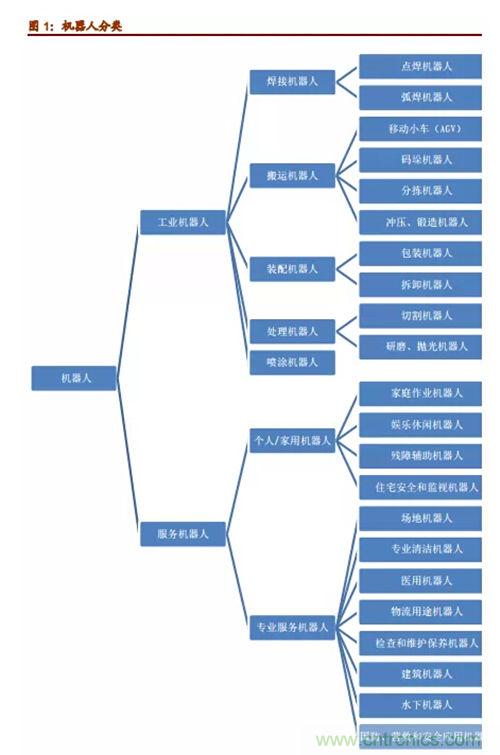 機(jī)器人專(zhuān)家從機(jī)器人應(yīng)用環(huán)境出發(fā),將機(jī)器人分為兩大類(lèi),即工業(yè)機(jī)器人和服務(wù)機(jī)器人。工業(yè)機(jī)器人根據(jù)用途不同,大致可以分為焊接機(jī)器人、搬運(yùn)機(jī)器人、噴漆機(jī)器人、涂膠機(jī)器人、裝配機(jī)器人、碼垛機(jī)器人、切割機(jī)器人、自動(dòng)牽引車(chē)(AGV)機(jī)器人、凈室機(jī)器人等。而服務(wù)機(jī)器人則是除工業(yè)機(jī)器人之外的、用于非制造業(yè)并服務(wù)于人類(lèi)的各種先進(jìn)機(jī)器人,主要包括個(gè)人/家用服務(wù)機(jī)器人和專(zhuān)業(yè)服務(wù)機(jī)器人。其中,個(gè)人/家用機(jī)器人主要包括:家庭作業(yè)機(jī)器人、娛樂(lè)休閑機(jī)器人、殘障輔助機(jī)器人、住宅安全和監(jiān)視機(jī)器人等;專(zhuān)業(yè)服務(wù)機(jī)器人主要包括:場(chǎng)地機(jī)器人、專(zhuān)業(yè)清潔機(jī)器人、醫(yī)用機(jī)器人、物流用途機(jī)器人、檢查和維護(hù)保養(yǎng)機(jī)器人、建筑機(jī)器人、水下機(jī)器人,以及國(guó)防、營(yíng)救和安全應(yīng)用機(jī)器人等等。
