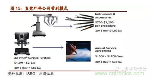直覺(jué)外科公司是全球領(lǐng)先的微創(chuàng)機(jī)器人輔助手術(shù)機(jī)器人公司,2013年?duì)I收達(dá)22.65億美元,截止2014年第一季度達(dá)芬奇機(jī)器人累計(jì)銷(xiāo)售數(shù)量為3039臺(tái),2014年8月總市值達(dá)159.60億美元。