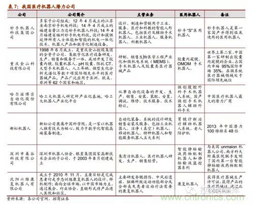 隨著醫(yī)用機(jī)器人技術(shù)的不斷突破和發(fā)展,從2005年開(kāi)始我國(guó)有一批重點(diǎn)高??蒲嗅t(yī)院?jiǎn)挝患把芯克谘芯酷t(yī)用機(jī)器人系統(tǒng)并取得了一些小成就,比如哈工大的微創(chuàng)腹腔外科手術(shù)機(jī)器已經(jīng)成功被專(zhuān)家驗(yàn)收,天津大學(xué)的妙手機(jī)器人在今年3月份開(kāi)始臨床使用;同時(shí),隨著醫(yī)用機(jī)器人商業(yè)化市場(chǎng)化的可能性愈發(fā)明晰,已經(jīng)有部分企業(yè)正在生產(chǎn)或者打算進(jìn)軍醫(yī)用機(jī)器人細(xì)分行業(yè),其中就包括機(jī)器人領(lǐng)先企業(yè)的博實(shí)股份和新松機(jī)器人。
