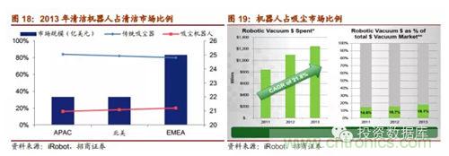 智能吸塵機(jī)器人是一個(gè)巨大的市場(chǎng),隨著經(jīng)濟(jì)水平和技術(shù)的提高,掃地機(jī)器人將會(huì)替代更多的傳統(tǒng)型掃地設(shè)備,2013年數(shù)據(jù)統(tǒng)計(jì),在家庭掃地市場(chǎng)上,北美市場(chǎng)為22億美元,機(jī)器人占18%;歐洲、中東及非洲地區(qū)(EMEA)市場(chǎng)達(dá)25億美元,機(jī)器人占20%;環(huán)太平洋與日本(APAC)市場(chǎng)為22億美元,其中機(jī)器人占16%。