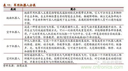(五)軍事機(jī)器人是21世紀(jì)各國(guó)軍事安全重點(diǎn)戰(zhàn)略:蒂爾集團(tuán)稱(chēng)未來(lái)10年全球無(wú)人機(jī)研發(fā)投入和采購(gòu)需求將達(dá)到940億美元。軍用機(jī)器人強(qiáng)國(guó)包括美德英法意以日韓,這些國(guó)家不僅在技術(shù)處于研究的先列,其產(chǎn)品已經(jīng)在軍事上有了實(shí)際運(yùn)用;我國(guó)與這些強(qiáng)國(guó)的技術(shù)差距明顯,受政策支持,軍事機(jī)器人相關(guān)企業(yè)發(fā)展前景明顯良好,可能成為企業(yè)未來(lái)強(qiáng)勁的收入保證。