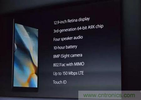 iPad Pro采用了12.9存屏幕,寬度和iPad Air的長度一樣,分辨率高達2,732*2,048,擁有560萬像素,比MacBook Pro還要高。后置800萬像素攝像頭。iPad Pro搭載A9X處理器,擁有了桌面級的處理器性能,速度是A8處理器的1.8倍,內存帶寬是A8X的2倍。同時在機身四周配置四個揚聲器,是iPad Air 2音量的三倍。蘋果聲稱iPad Pro比80%的筆記本電腦的處理速度都要快。新款iPad Pro的CPU處理能力是初級iPad 22倍,圖形處理能力是初級360倍。