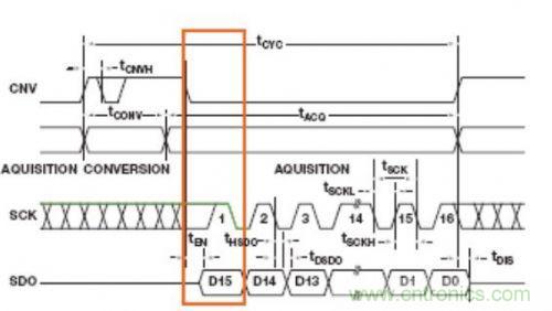公司帶SPI接口的許多SAR ADC都是從CS或CNV的下降沿為MSB提供時鐘信號,剩余的數(shù)據(jù)位則跟隨SCLK的下降沿,如圖3所示。在讀取MSB數(shù)據(jù)時,要使用等式中的tEN而非tDRV。
