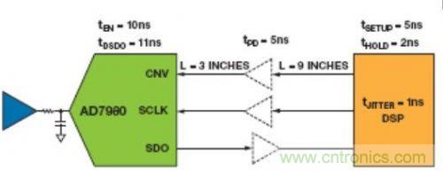 在圖4中,DSP主機訪問AD7980處于3線CS模式下,其中,VIO = 3.3 V。DSP鎖存SCLK下降沿上的SDO信號。DSP的額定最小建立時間為5 ns,最小保持時間為2 ns。對于典型的FR-4PCB板,傳播延遲約為180 ps/in。緩沖器的傳播延遲為5 ns。CNV、SCLK和SDO的總傳播延遲為