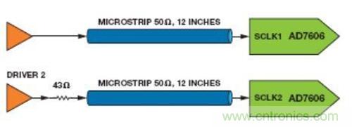 在圖7中,一個驅(qū)動器通過一條12英寸的微帶線路連接SCLK1,另一個驅(qū)動器通過一個與微帶串聯(lián)的43Ω電阻連接SCLK2。